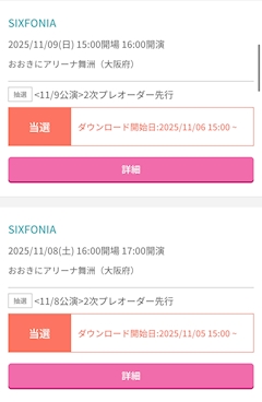 こんちは なつきさんです(๑•̀ㅁ•́ฅ✨ シクフォニのライブ無事当選しました〜!!!! 今回のシクフォニライブ4公演あるんですが 4公演中、3公演当たってしまいました。 え?これはいいんですか?神はなつきに「ライブ全通しろ」って言ってるんですか????? ありがたく全通させて頂きます…_:( _ ́ཫ`):_ ほんと嬉しすぎて仕事頑張れる頑張る糧になる ありがとう神様 なつき、お仕事頑張ります💪( ¨̮ 💪)フンヌッ…!! これは2公演のスクショ🫶