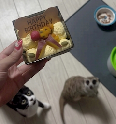 つい先日 我が家の最愛のミーアキャット ティモンが誕生日を迎えて 7歳になりしました👏 毎年この時期は ケーキで些細なお祝いをしてます🎂💗 今年は ティモンの大好物 お芋のと野菜のケーキにしたよ🍠︎💕︎ 今年からはルナもいるよ🐱 ミーアキャットは雑食なので 犬猫が食べるものは 基本的になんでも食べるし ティモンは果物や野菜も大好き! ほんとよく食べる子です💖 今年のケーキも 大喜びで食べてくれました🥰 もう6年くらい一緒に居て 私がひとりで育ててきた子 私が産んだとすら思う🌹 これからもずっと元気に過ごしてほしい ずっと一緒に居てほしい 歳を取るのは ゆっくりでいいからね☘ 大切な我が子達💗