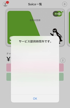 夜中にスイカのチャージしようと思ったらサービス時間外て言われました いや、電子チャージだから24時間対応してて… かなしいです り