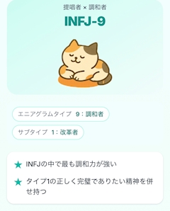 新しいMBTI診断 私はずっと提唱者なんですが その中でもINFJー9といって どうやら調和力が高いタイプでした! 確かに調和力というか 超平和主義者で争いや揉め事は 極力回避して 常々生きていたい思ってます🙂↕️ 見た目に反して気も弱いし 争いが起きるくらいなら 自己犠牲の精神で なんか長女症候群?みたいな特徴も ある気がする でもそんな中でも 譲れないものに関しては (タトゥーとかのアイデンティティ) 頑固になってしまうので こういう見た目と性格のギャップが 強く出てしまうのかもしれないですね🤔💭 文字にして自分を客観視するの 結構好きです😂