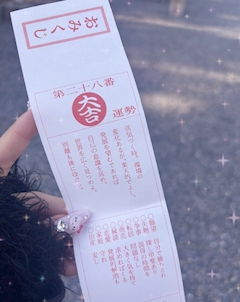 今年初のおみくじ引いたら なんと大吉でした👏 わーい!🙌 実は去年も熱田神宮で 大吉だったし 3連続くらい続いてる気がする💭 強運かもしれない✨️ 人生いろいろ 山あり谷ありだけど 心穏やかに平穏に平和に ずっとそんな感じの人生だとありがたいな〜💓