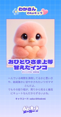 りんさんに教えて貰って koiキャラメイカー やってみました‼️ やってる最中に お呼ばれしてしまい りんさんに結果を伝えられてなかったので ブログでお伝え‼️ (こんとQRコード読み取ってください✨️) 結果はインコ‼️ わがままな女という 結果です。 前やった 恋愛診断❓も 主人公で 自己中みたいな結果だったので なにも変わってませんネ 逆に信ぴょう性がある。 りんさん 診断系の最先端をいつも行ってるの すごすぎる 情報が早いなーってなります