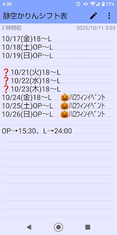 かりんです🍁🍁🍁 今週と来週のシフトです🌾 10月も後半戦ですね🌾🌾🌾 時の流れが早すぎる、 あっという間に今年 終わってまうで。。。🙃 今週は金土日だけいます🍁 今週末は通常営業です🌾🌾🌾 来週は金土日は確定だけど、 平日はどこ出るか迷ってます😖 多めに休みたいけど、10月前半 結構たくさん休んでたから、 そろそろちゃんと出ないと 詰められそう~~チキチキレース🐔 来客ある日は優先的に出ますので ご一報ください!🎀🎀🎀 来週末はハロウィンイベントです🎃 世間よりひと足早いですが、皆で ワイワイ仮装できたら楽しそう🦇✨ 普段からコスプレなので、 ハロウィンイベントの衣装 毎年迷う😂 キョンシーはもう 着すぎだと思うので封印です🙃 去年着てたやつか、今年新しく 買ったやつ着てると思います🎀 10月後半戦もたくさんの ご来店お待ちしております🍁 かりんでした🎃🎃🎃