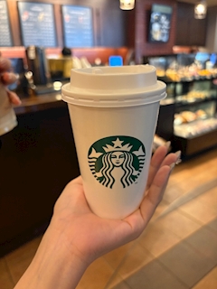 新作のパンプキンのんだのにホットだから中身が見えない、、、 スパイシーな味でした🎃 あつあつだから、底で支えてる図です笑 りん